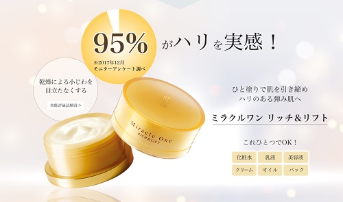 「ミラクルワンリッチ&リフト」は、年齢肌にアプローチする美容成分を贅沢に配合し、さらに3種類の天然オイルが肌を柔らかく整えてくれるアイテム。